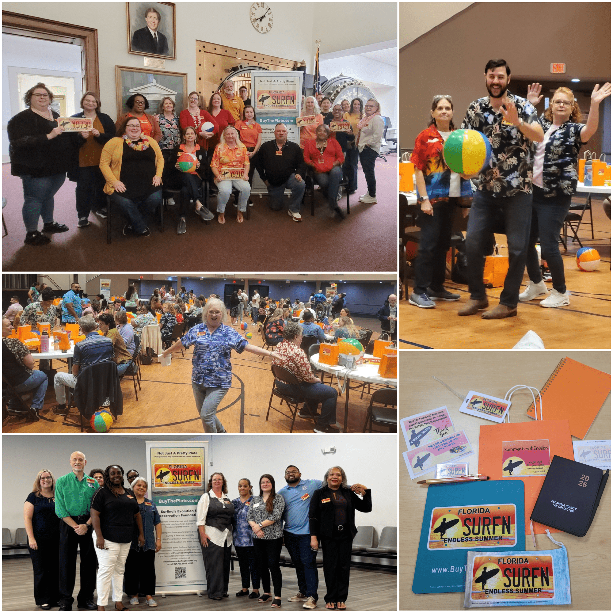 Surfing’s Evolution & Preservation Foundation provided banner signage for the tax collector office locations that inform consumers about the plate, as well as goody bags and pizza for employees during the in-service. Scott Lunsford, Tax Collector for Escambia County, got the morning started with a lively introduction about promoting the plate, followed by trivia games and activities.